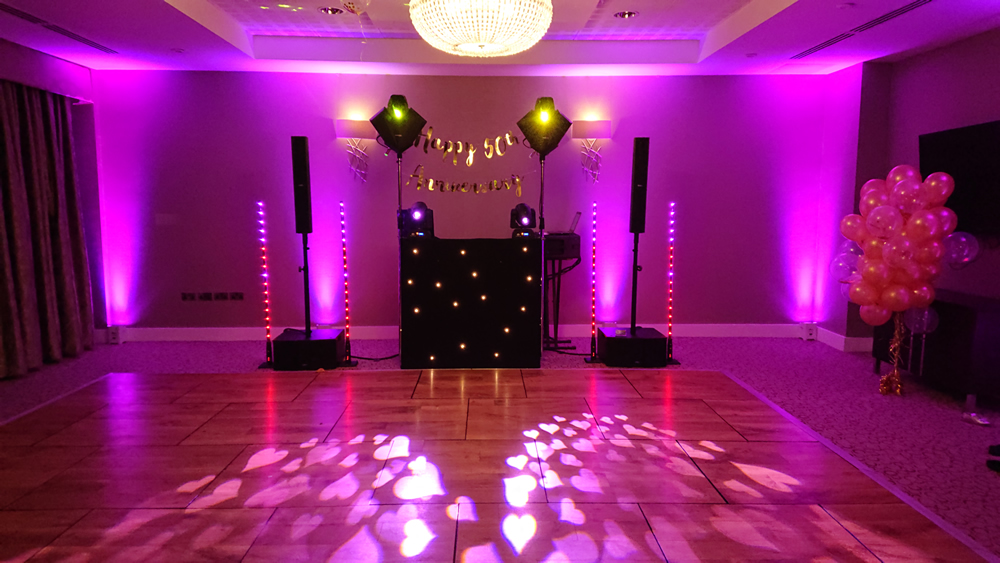 Up-Lighting, sometimes known as mood lighting, a wash lighting effect around the room or areas of your choosing, you can also choose the colours which we can programme as static colours or fades or runs between colours. The lights we use are top of the range Chauvet Hex lights which provide the most advanced combination of colours available on any light, they are also Wi-Fi which means we can place them anywhere in the room as they have no wires to restrict their placement- Price on application